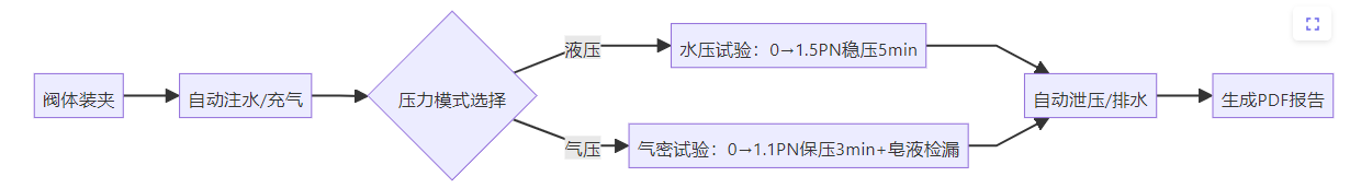 閥體裝夾 自動注水/充氣 壓力模式選擇 水壓試驗:0→1.5PN穩(wěn)壓5min 氣密試驗:0→1.1PN保壓3min+皂液檢漏 自動泄壓/排水 生成PDF報告